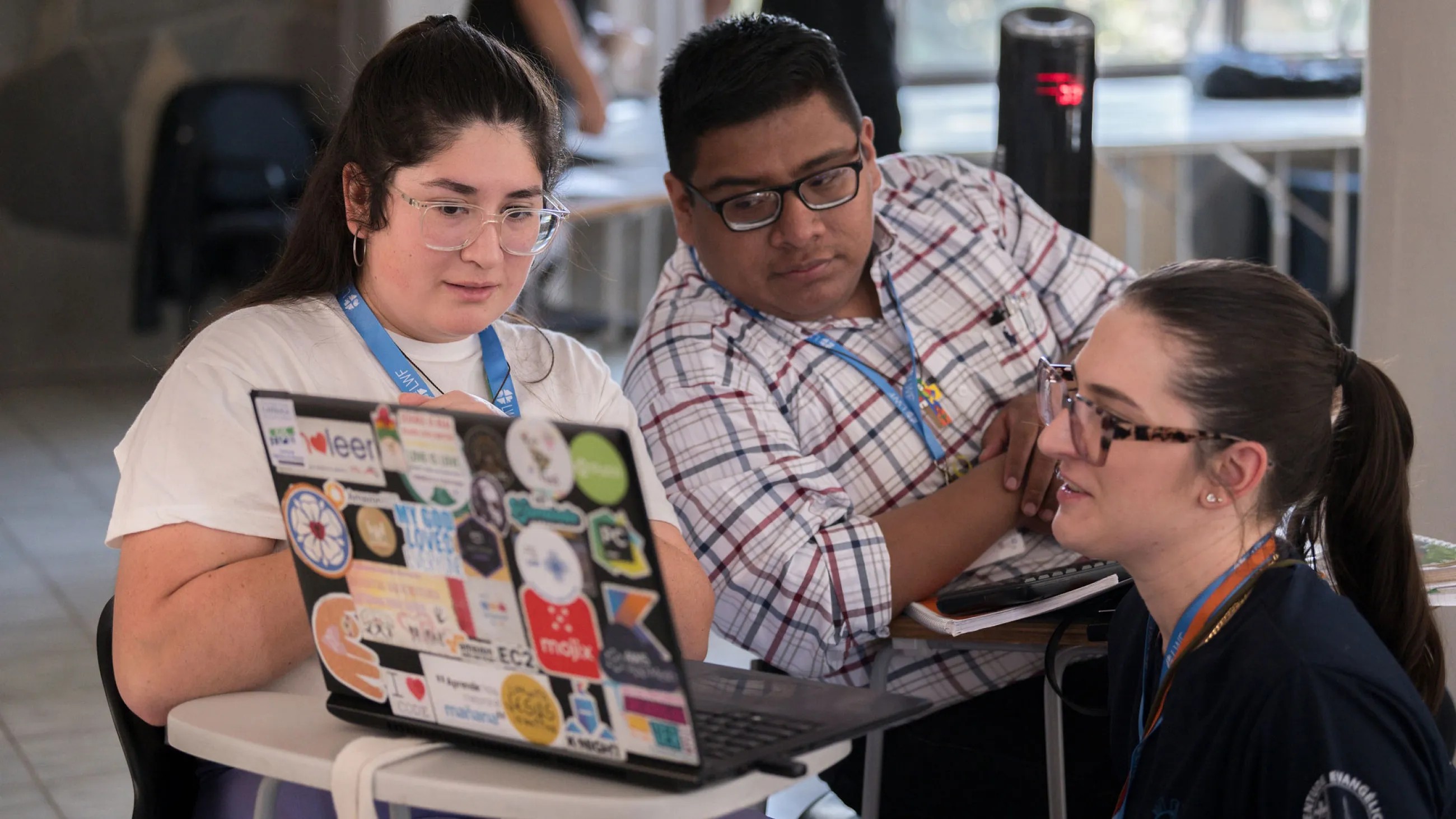 Rocio Choque (links) von der Vereinigten Evangelisch-Lutherischen Kirche in Argentinien im Gespräch mit Rodolfo Catunta Uturunco (Mitte) von der Bolivianischen Evangelisch-Lutherischen Kirche und Isabella Reimann Gnas (rechts), der LWB-Vizepräsidentin für die Region Lateinamerika und die Karibik. Foto: LWB/Albin Hillert