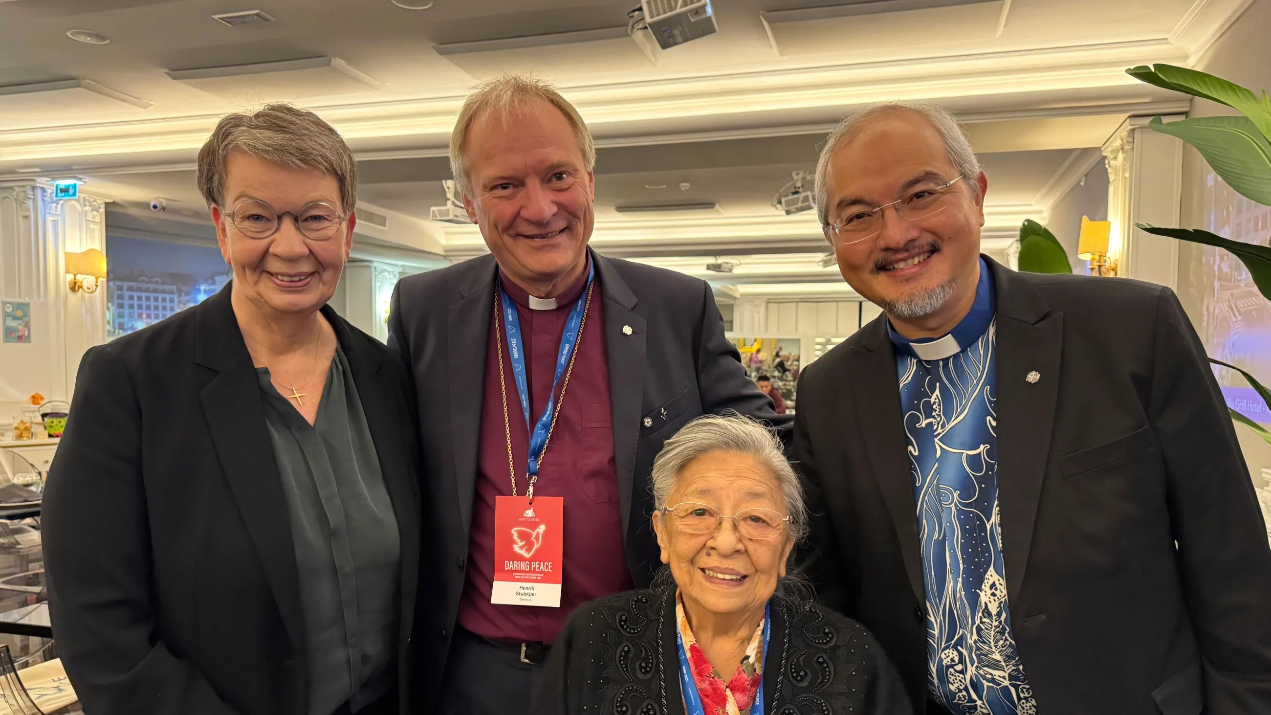 Von links nach rechts, stehend: LWB-Vizepräsidentin Bischöfin Kristina Kühnbaum-Schmidt, LWB-Präsident Bischof Henrik Stubkjær und der Direktor der LWB-Abteilung für Theologie, Mission und Gerechtigkeit, Pfr. Dr. Sivin Kit, mit Kondo Koko, einer Überlebenden des Atombombenabwurfs von Hiroshima, beim Friedenstreffen von Sant‘Egidio. Foto: Sant‘Egidio