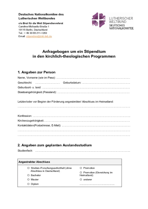 Anfragebogen um ein Stipendium in den kirchlich-theologischen Programmen