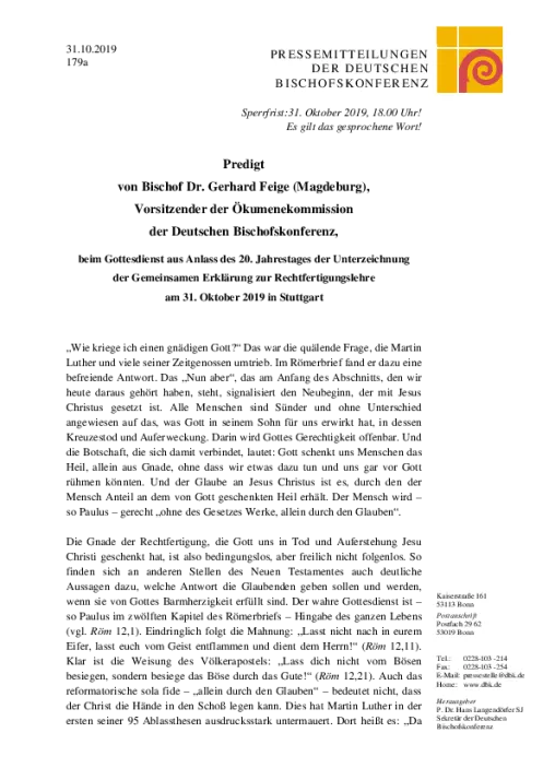 Predigt von Bischof Dr. Gerhard Feige (Magdeburg), Vorsitzender der Ökumenekommission der Deutschen Bischofskonferenz, beim Gottesdienst aus Anlass des 20. Jahrestages der Unterzeichnung der Gemeinsamen Erklärung zur Rechtfertigungslehre am 31. Oktober 2019 in Stuttgart