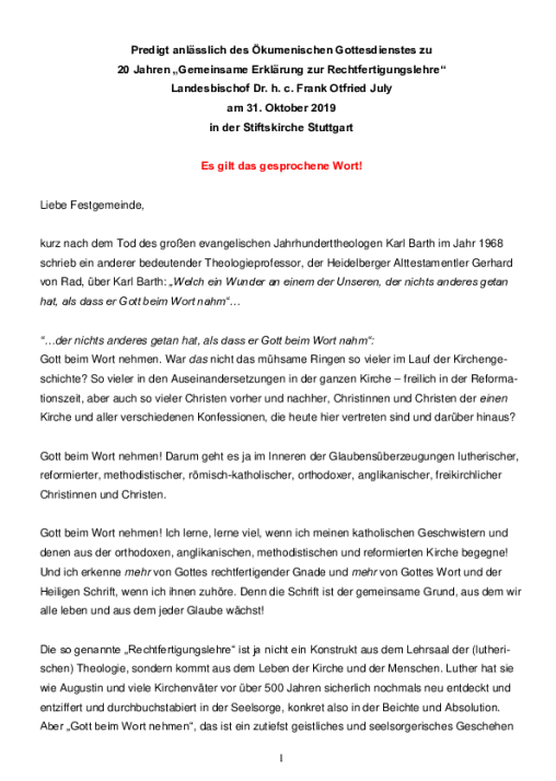 Predigt von Landesbischof Dr. h. c. Frank Otfried July anlässlich des Ökumenischen Gottesdienstes zu 20 Jahren „Gemeinsame Erklärung zur Rechtfertigungslehre“ am 31. Oktober 2019 in der Stiftskirche Stuttgart
