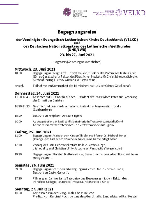 Delegation der VELKD und des Deutschen Nationalkomitees des Lutherischen Weltbundes vom 23. bis 27. Juni 2021 in Rom