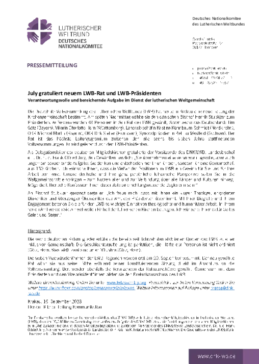 July gratuliert neuem LWB-Rat und LWB-Präsidenten