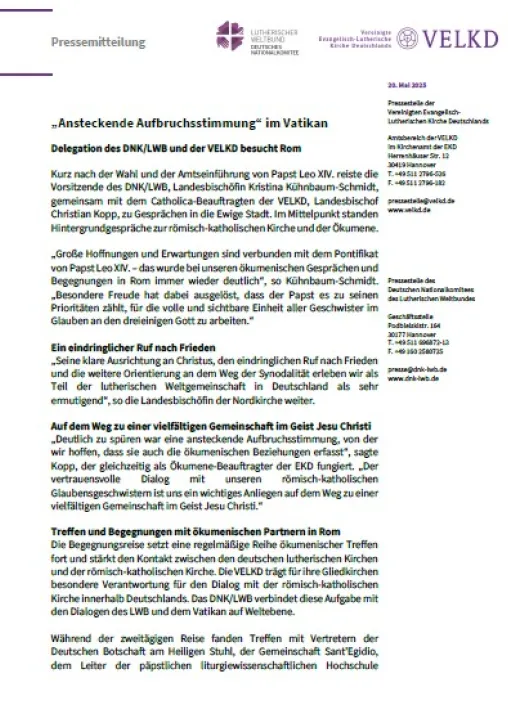 „Ansteckende Aufbruchsstimmung“ im Vatikan Details Sprachen: Deutsch „Ansteckende Aufbruchsstimmung“ im Vatikan Downloads File PM Delegation des DNK/LWB und der VELKD besucht Rom